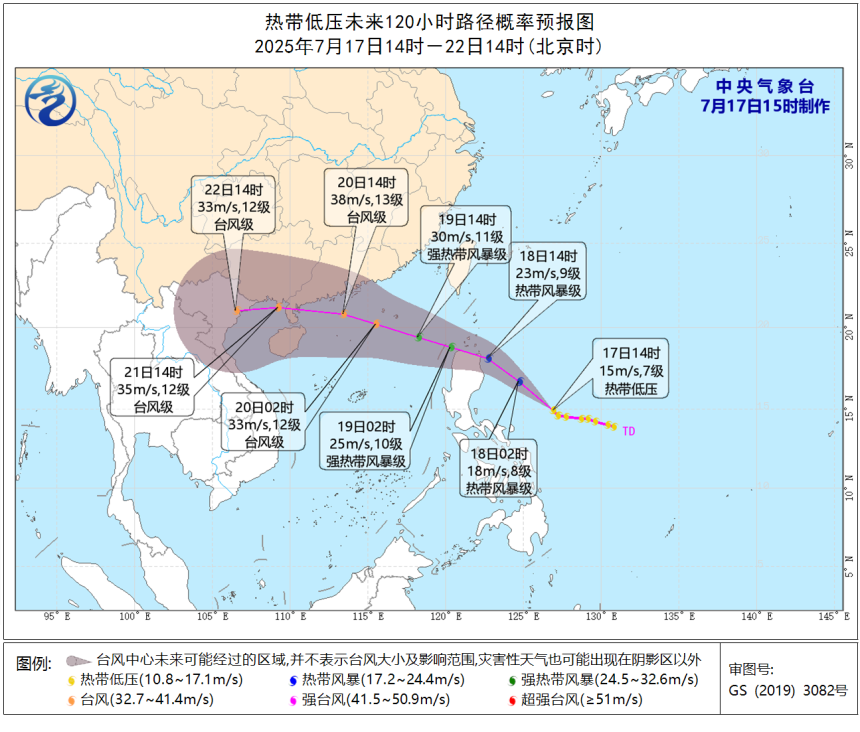 预计,热带低压将以每小时25-30公里的速度向西北方向移动,强度逐渐增强,将于24小时内加强为今年第6号台风,18日下午至傍晚擦过或登陆菲律宾吕宋岛东北部,19日上午移入南海东北部海面,强度继续加强,最强可达台风级或强台风级(13~14级,38~42米/秒),并逐渐向广东西部到海南岛东部一带沿海靠近。